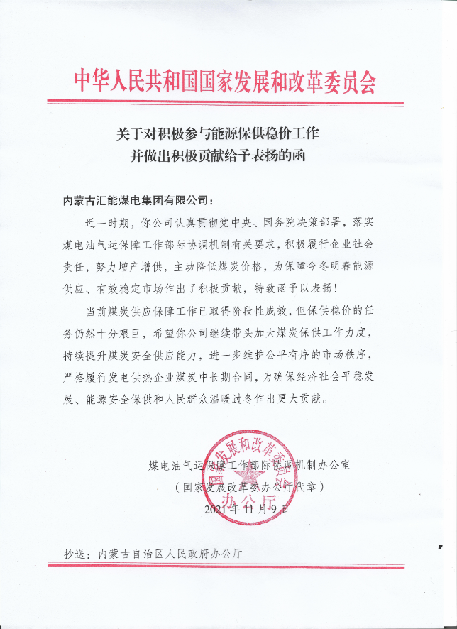 国家发改委关于对积极参与能源保供稳价工作并做出积极贡献给予表扬的函